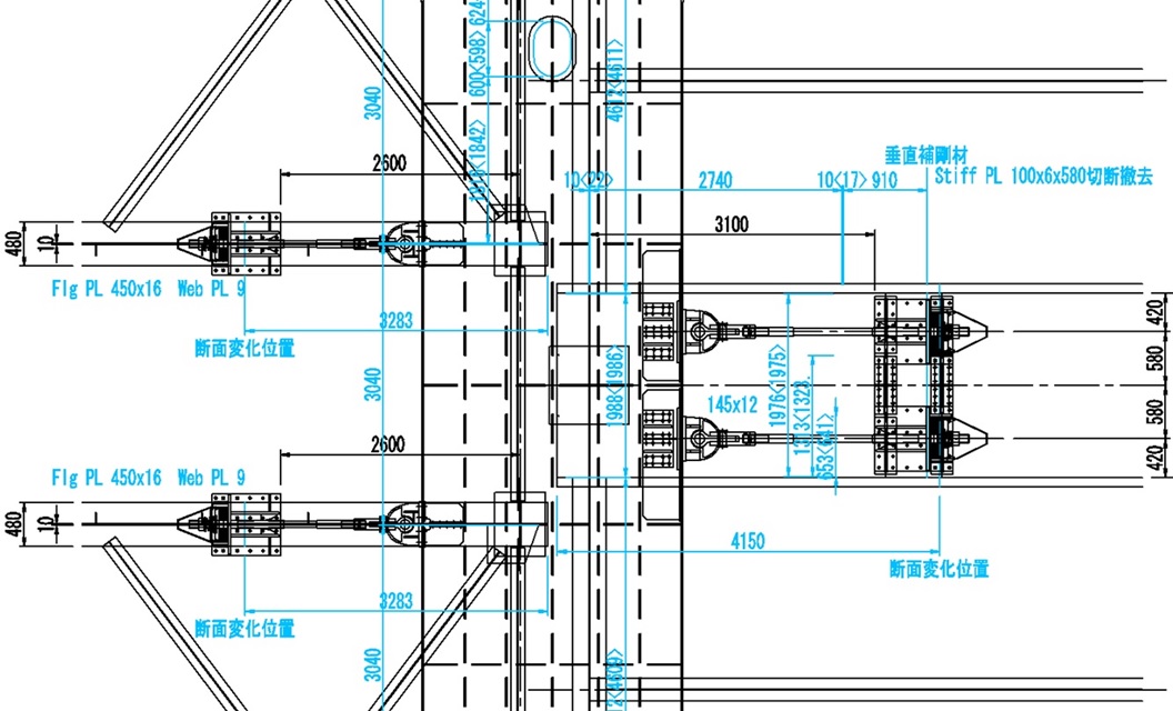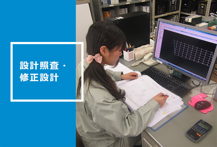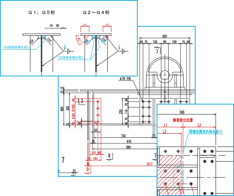 到来図工事(お客様から設計結果を受領する工事)では、設計照査が必要となります。具体的には、計算書の内容照査、計算書との照合、図面の照査などを行います。 また、設計照査の結果、製作・架設上問題が生じると判断された場合には、図面修正を含む代替案のご提案や、必要に応じた修正設計を行います。 さらに、近年増加する補修・補強工事を含めて、現況の調査結果を図面作成に的確に反映することも欠かせません。こうしたお客様のニーズがある場合には、長年培った経験を活かしてスピーディーに対応します。