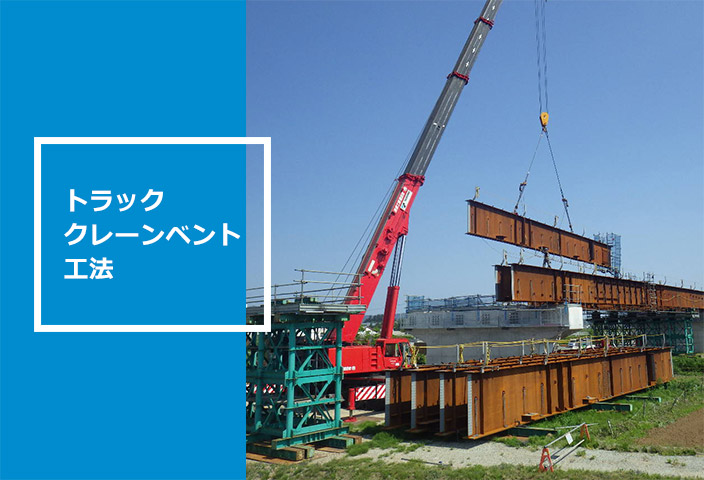 架設で、最も一般的に用いられる工法です。 ベントと呼ばれる仮支柱で桁を支えながら、トラッククレーンにより架設を行います。 経済的で、短期間に架設を行うことが出来るのが強みです。