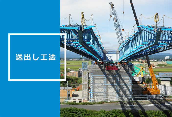 架設現場に隣接した場所で、地組立した橋体を台車やジャッキ等を使用して、桁を送出して架設する工法です。 桁下空間に制約がある場合によく採用されます。