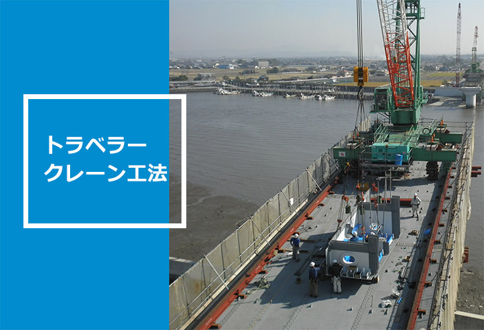 橋体の上にトラベラークレーンを使用して架設する工法です。 桁下空間が使用できず、送出し工法が採用されない場合に適しています。