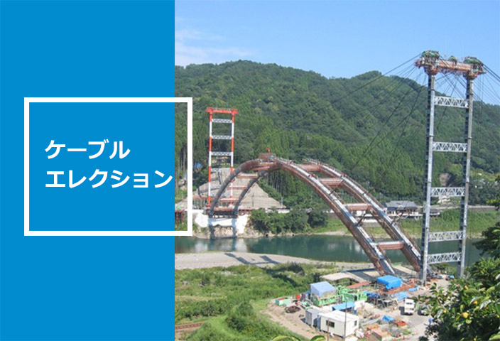 鉄塔から張り渡したケーブルで橋体を支持する架設工法です。 桁下空間が使用できず、大型の移動式クレーンの進入が困難な場合に採用されます。