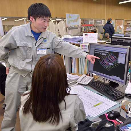 原寸では、設計照査が終わった図面をもとに橋梁を作るための加工データを作成したうえで、ものづくりに支障がないかどうかの確認を行います。