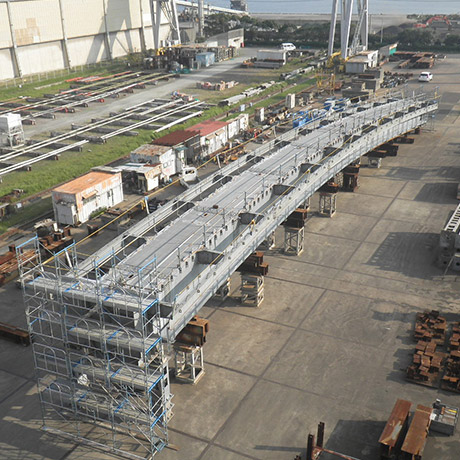 実仮組は、架設現場と同じように部材を実際に繋げて組立てて行き、図面通り製作されているか、部材の取り合い等に問題はないか確認を行います。