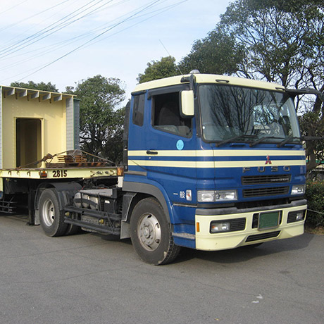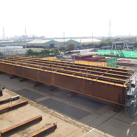 塗装まで完了した部材を架設地点まで搬送します。陸上輸送可能な場合は、トラックやトレーラーを使って輸送を行いますが、陸上輸送が困難な場合は、海上輸送も行います。