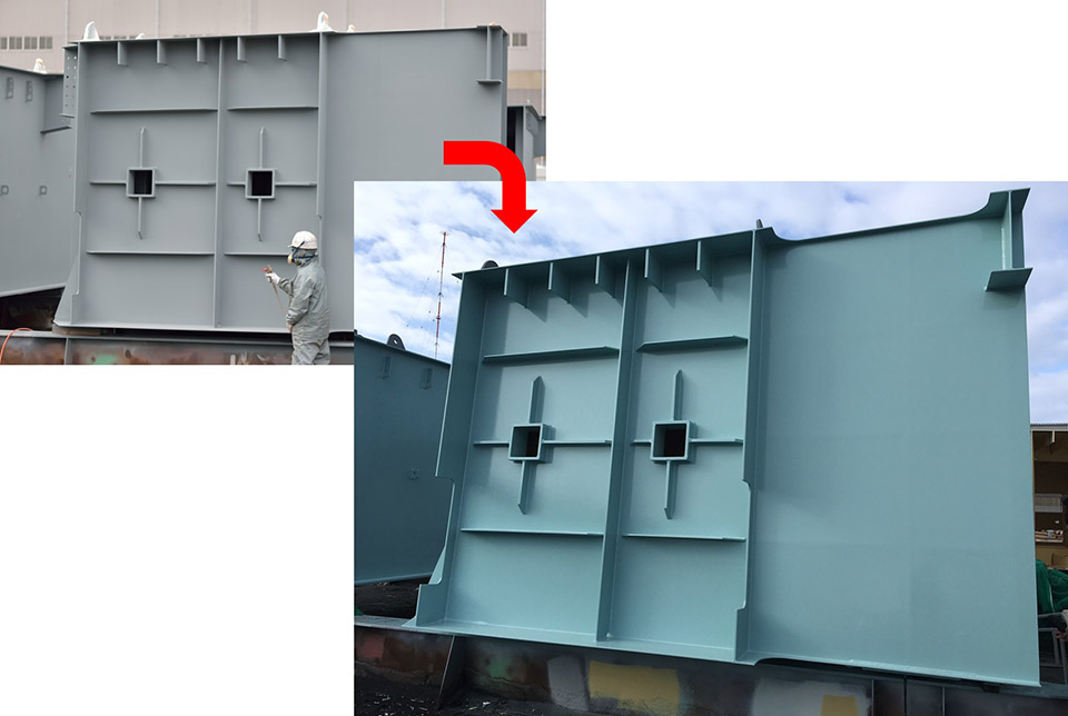 必要箇所に養生を行ったのち、部材全体に塗装を行います。塗装を行うことで、橋の防錆・防食性能を高めます。最近では、耐候性仕様も増えてきています。