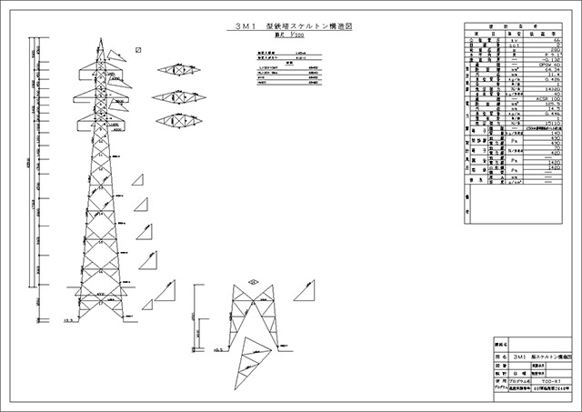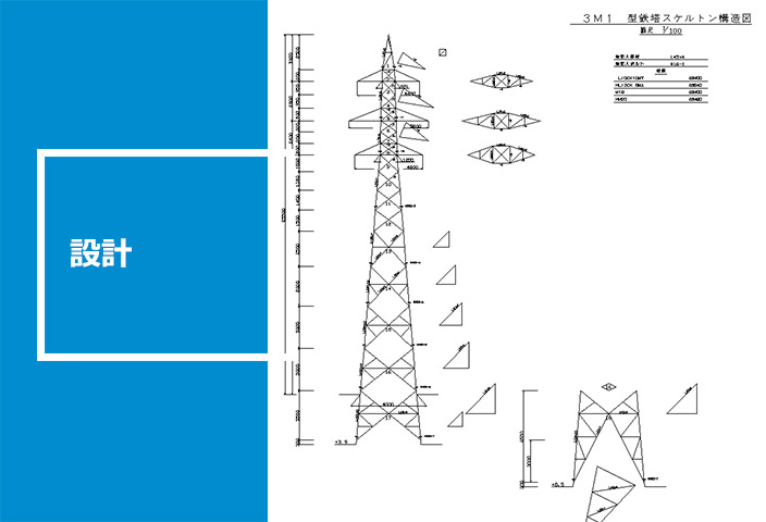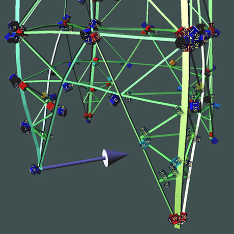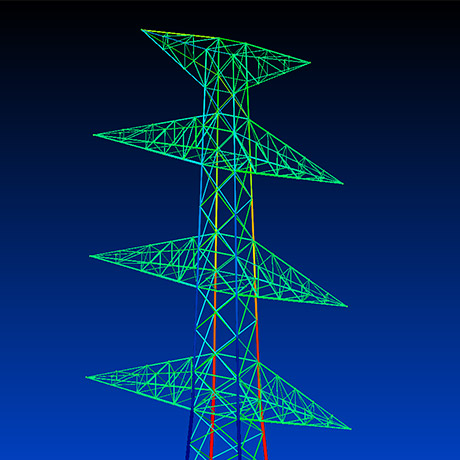 お客様からご提示頂く強風、地震などの荷重条件、および、電線、アンテナなどの各諸元をもとに、自社開発の最先端鉄塔設計プログラムを用いて、新設鉄塔の設計や既設鉄塔の強度検討設計を迅速に行っています。また、耐震強度評価設計や、不同変位が生じた鉄塔の強度検討設計では、立体解析や動的解析から得られた応力と部材の強度を用いて、鉄塔の安全性を評価しています。