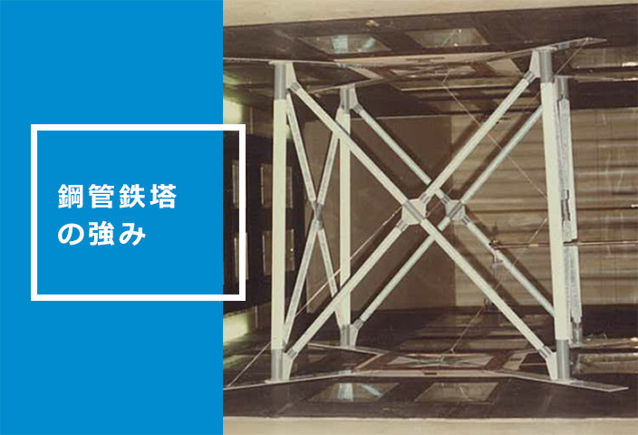 そこで、当社では風荷重を低減させつつ、適切な構成部材とすることを目的として中空鋼管鉄塔を開発しました。現在、大規模鉄塔では、この中空鋼管鉄塔が採用されています。