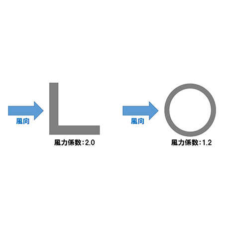 鉄塔設計において最も重要な荷重は風荷重になります。電圧が高くなり、鉄塔規模が大きくなるに伴い、その風荷重が非常に大きくなります。一般的に小規模な鉄塔で採用されている鋼材は山形鋼ですが、風力係数が2.0と大きく、220~500kV以上の鉄塔で山形鋼を採用すると設計荷重(風荷重)が大きくなるため、必然的に基礎への荷重も大きくなります。設計荷重と基礎への荷重が大きくなるということは、部材と基礎が大きくなることを意味し、不経済な設計になることが懸念されます。
