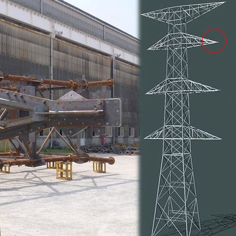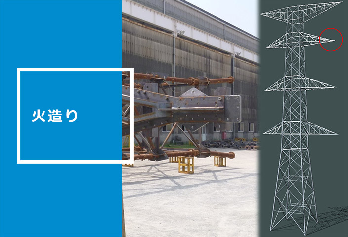 鉄塔は一般的な建築構造物とは異なり、3次元的な傾斜を多数有する構造物です。従って、平面上でつなげるような継手部構造では取り付かず、各部材同士の取り付き角度を考慮した継手構造とすることが必要となります。そこで、鉄塔では各部材が問題なく取り付くように、部材の端部を熱間で3次元の曲げ加工を行っております。