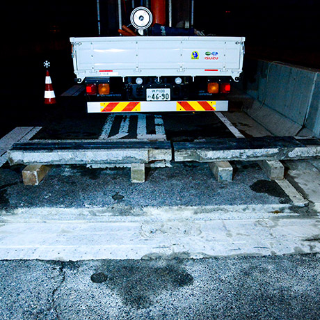 現在、橋梁伸縮継手の撤去の大半では、コンクリートブレーカが使用されています。これに対して、残存床版へのダメージを極限まで抑えるために誕生したSJS-H工法は、ワイヤーソーを用いて低騒音かつ低振動を実現し、これに伴い夜間施工を可能にした画期的な工夫です。 私たちは、同工法にさらに改良を重ねることで、乾式ワイヤーでの施工を実現しました。切断時に発生する汚泥水ゼロの実現により、養生の負担が格段に減少するとともに、湿式ワイヤーを凌駕する切断スピードで、施工時間の大幅短縮も実現しています。 こうしたことから、作業騒音でお困りのお客様や、コンクリートブレーカによる既設床版のマイクロクラックにお悩みのお客様に、非常に高い評価を頂いています。